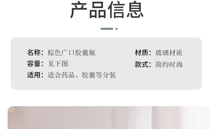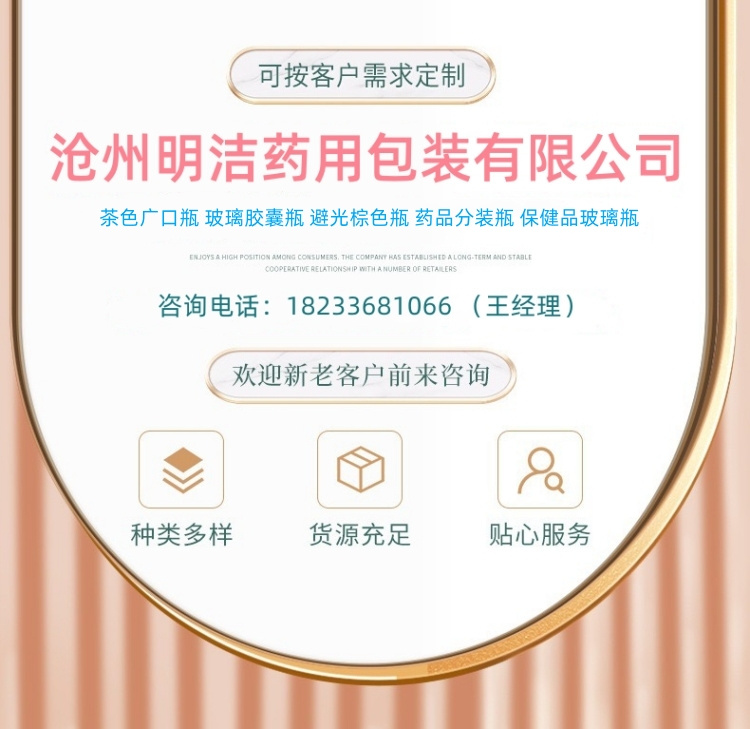 滄州明潔關注于保健品玻璃瓶,藥品分裝瓶,棕色藥瓶,茶色膠囊瓶,棕色膠囊瓶,玻璃密封瓶,棕色廣口瓶,避光膠囊瓶,廣口藥品瓶,茶色玻璃膠囊瓶,茶色片劑瓶,棕色藥瓶,保健品玻璃瓶,廣口藥品瓶,藥片瓶,產(chǎn)品規(guī)格多,款式新穎,品質(zhì)過硬。