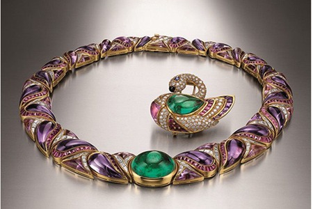 在上世紀(jì)中后期,大膽的彩色寶石鑲嵌成為了寶格麗的特色。造型尊貴華麗,具有厚重感。紫紅色寶石以斜邊幾何圖形嚴(yán)絲合縫地銜接起來(lái),以鉆石作為鑲邊,弧面祖母綠寶石有著_的通透度,重達(dá)41克拉以上,成為_(kāi)的代名詞。它和一顆相同配額色的天鵝胸針是配套,打造從顏色炫彩的_項(xiàng)鏈。