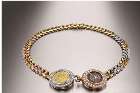 復(fù)古經(jīng)典和當(dāng)代美學(xué)相結(jié)合的_項(xiàng)鏈,螺旋形狀的項(xiàng)鏈,金銀銅色不斷轉(zhuǎn)變,以金屬和鉆石打造出立體感,中間的裝飾是兩顆古羅馬錢(qián)幣,拜占庭的輝煌雍容盡顯其中。人頭圖像外邊一圈鉆石裝飾,在歲月的流轉(zhuǎn)中盡顯華貴。Monete系列當(dāng)時(shí)_成為了明星華貴喜歡的款式。