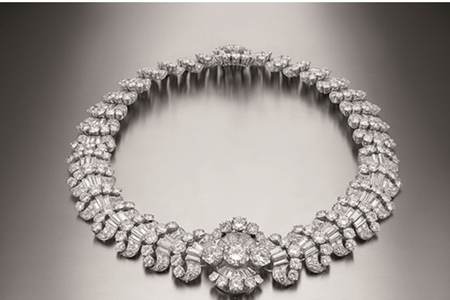 經(jīng)典的鉑金項(xiàng)鏈幾何造型_,嚴(yán)謹(jǐn)?shù)膶W(xué)院風(fēng),一脈相承的典雅,1959年的這條項(xiàng)鏈,運(yùn)用了大量的鉑金,法式風(fēng)格_。顆粒和條形相契合,中間的花形以大顆圓形作為焦點(diǎn),其他鉆石圍繞綻放,整體是一個(gè)圓潤(rùn)的弧形耀眼奪目。