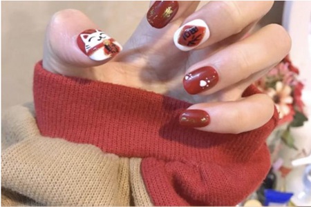 啞光車?yán)遄拥念伾哂袝r(shí)尚感,金色鉑片黏貼在上面。倒立的福字結(jié)合傳統(tǒng)的喜慶元素,_適合做過(guò)年時(shí)候的美甲。在大拇指上用白色填充招財(cái)貓的形狀,畫出貓咪的五官和胸口的叮當(dāng),_后用透明甲油保護(hù)一層。