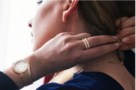 做到了_和低調(diào)相結(jié)合的小鉆珠寶,在設(shè)計上也是別處新意。雙層閃鉆在金色指環(huán)上,雖然每顆的體積不大,但是配合起來的效果卻極為璀璨。戒指配上同色系手邊,以小鉆裝飾金色表盤,凸顯女性的現(xiàn)代典雅美感。