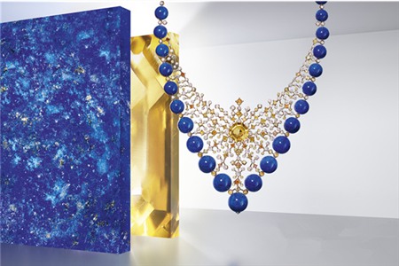 項鏈以放射狀的設(shè)計感打造渾然天成的吸引力,具有動態(tài)的美感。黃藍配色優(yōu)雅典麗,鉆石和黃色石英排列,周圍一圈藍寶石眾星拱月,具有皇冠一般的形狀。天衣無縫的設(shè)計造型,不管從哪一個角度看都是光芒四射。這_項鏈極為華麗,和它相配還有一對耳環(huán),充滿異域風格的不規(guī)則形狀,將寶藍色的典雅散發(fā)到_。
