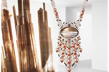 超級有重量感的_項鏈,重心是棕褐色的切割發(fā)晶,重量足足達到有68.85 克拉,戴上的氣質(zhì)_。自然的花紋在凸面下變得充滿魔力,四周是金色和紅色的寶石交織,玫瑰金的鉆石鑲嵌在其中,讓整條項鏈變得華麗_,令人嘆為觀止。