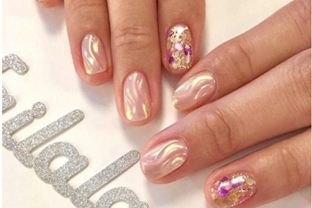裸粉色的美甲在時陽光下泛出金色的光,溫柔的波浪和閃爍的亮片配合,指甲_光彩,玫紅色的點綴讓指甲顏色更加跳脫。