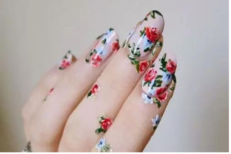 著色濃郁的大花具有復(fù)古感,在手指上用彩繪的方式來畫出這些花朵。先用裸色甲油做低,這樣畫出來的花朵顏色會更加逼真?;ǘ湫枰萌N顏色來表現(xiàn)才會真實,添加上綠葉_大功告成。