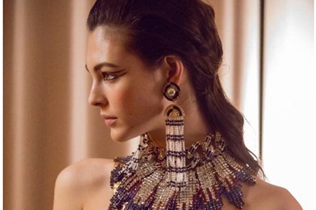 模特佩戴的項(xiàng)鏈珍珠以金屬代表地位,用珍珠作為串聯(lián),和一層搭肩首飾疊戴,以埃及壁畫作為衣服花紋,帶來沖擊性的視覺享受。