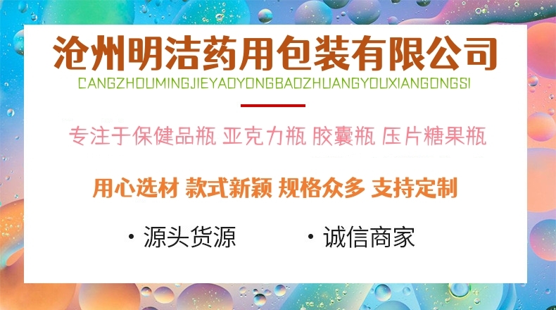 滄州明潔關(guān)注于生產(chǎn)保健品瓶,藏紅花瓶,亞克力圓柱瓶,膠囊瓶,鈣片粉劑瓶,中藥粉瓶,藥片瓶,藥丸瓶,軟膠囊瓶,亞克力瓶,壓片糖果瓶,保健品塑料瓶,產(chǎn)品規(guī)格眾多,外觀新穎,彰顯大氣。